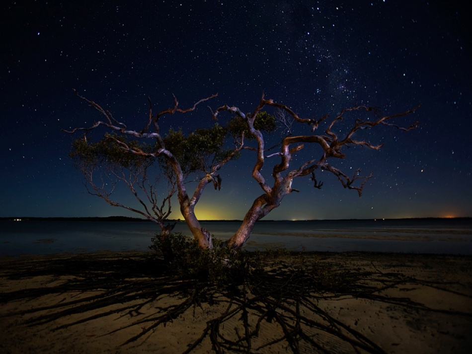 We had two nights in which to capture this subject, but on the first night I managed to take my one and only usable image. The light of the moon, coming from behind me in this shot, became quite intrusive, so we had to stop shooting when it moved into the frame. I used a wide-angle lens so that, at a shutter speed of 90 seconds or less, I could capture the stars without obvious trails. There were three gnarled and crazily shaped trees standing next to each other along the edge of the bay. Behind us was a camping area on either side of the road that led to the vehicular ferry to Fraser Island. This is a popular place to camp during vacations, but is not so busy in winter. Sadly the tree has been chopped down for firewood since this photo was taken.