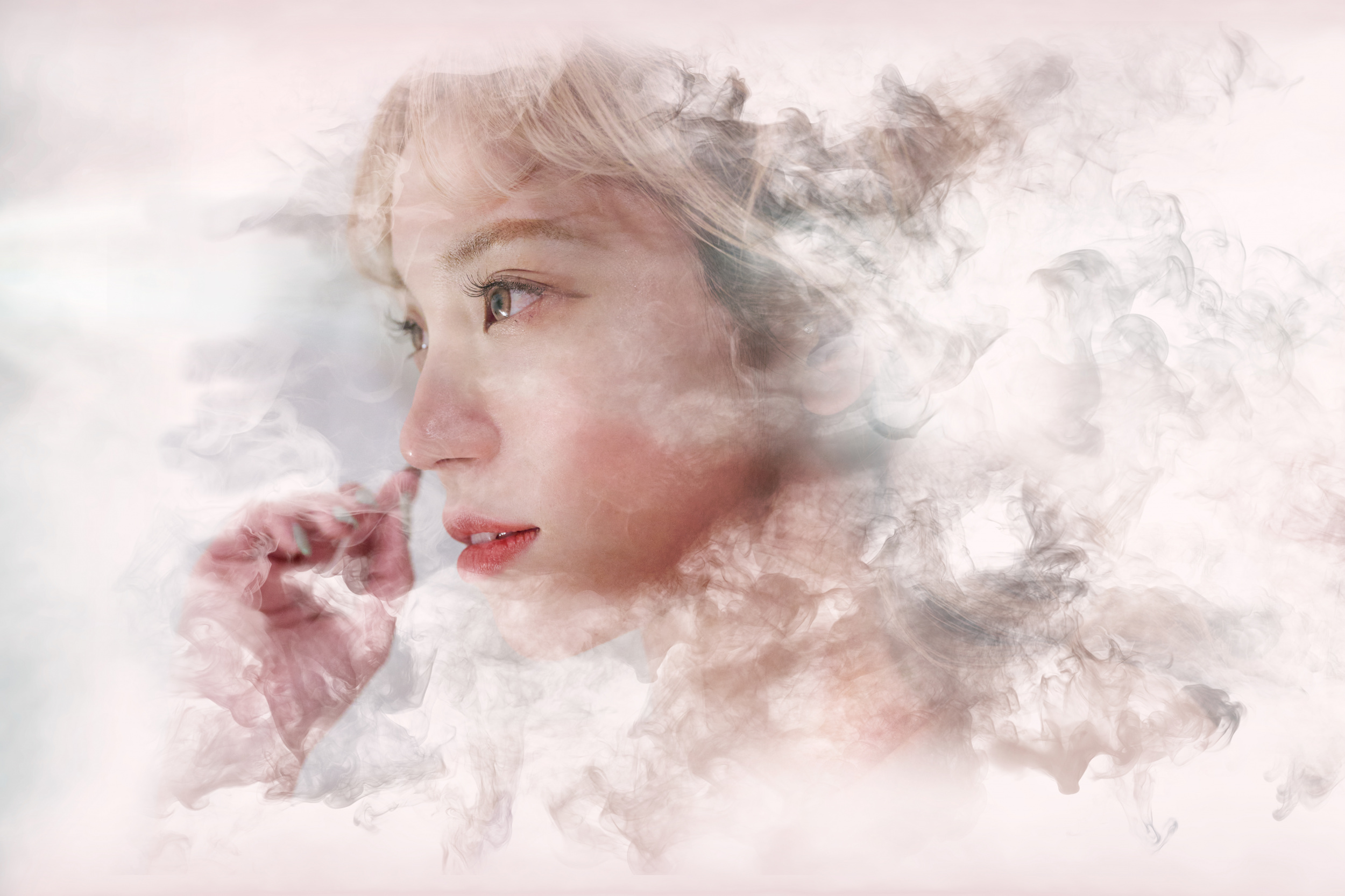 Technical Process: For this work, I used Photoshop brushes made from smoke images, applying them to specific areas of the model to make her appear as if she were dissipating. Layer masks and brushes helped refine the contours, while actual smoke overlays were added in difficult areas to create a seamless integration. Simply drawing smoke shapes can look unnatural, so I used blur filters strategically to maintain depth of field.